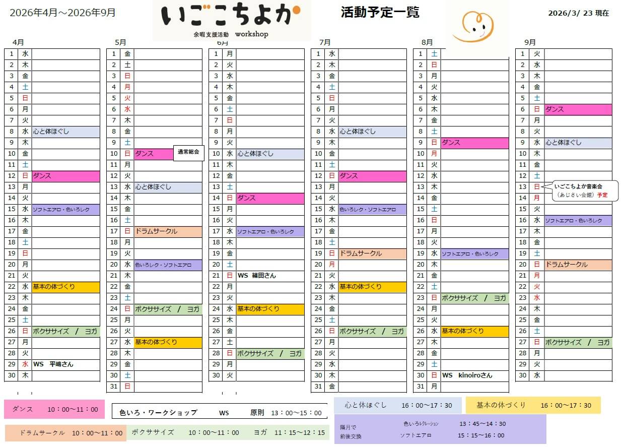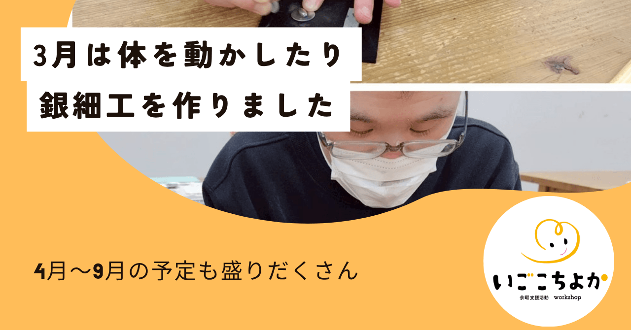 学校の卒業と引っ越しが重なり、(子供が)環境の変化で引きこもりがちだったのですがいごこちよかに参加するようになって休日の過ごし方が活動的になりました。毎月のカレンダーをじっくりと眺めて自分で行く日を決めています。私も一緒に活動することがとても楽しく硬い体を感ばって動かしています。お料理のメニューは初めて作るものばかりでいつも楽しみです (Tさんのご家族)