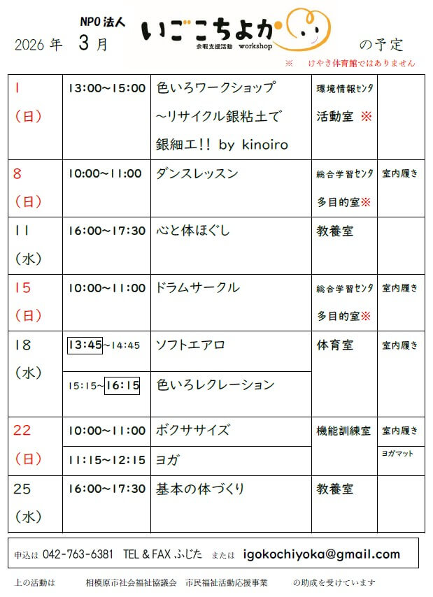3月は、活動場所がけやき体育館以外が多くなっています。