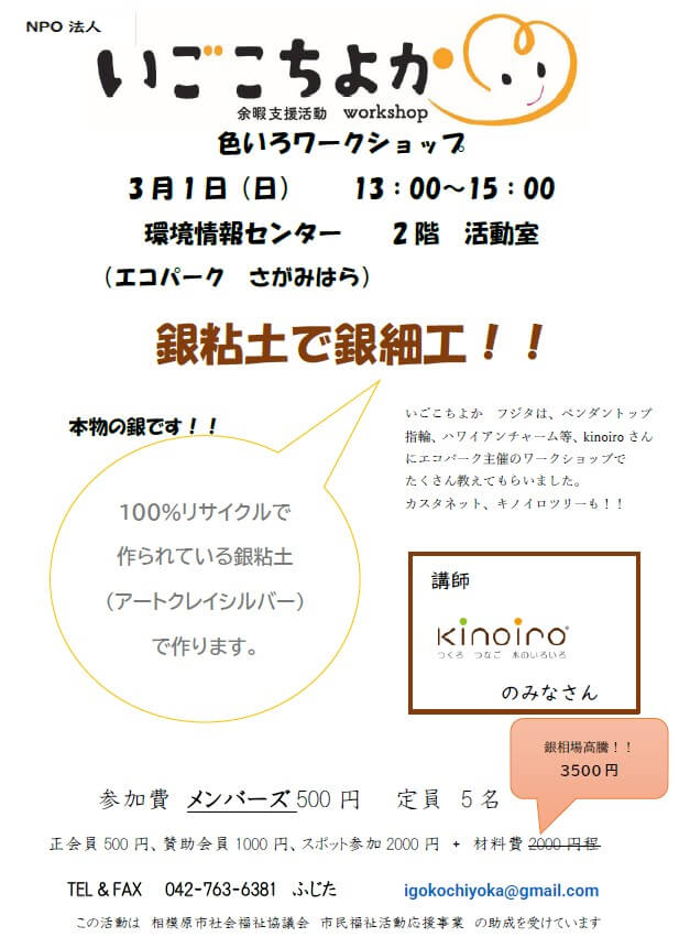 リサイクル銀粘土を使って、オリジナル銀細工の工芸ワークショップです。